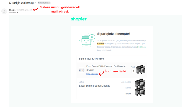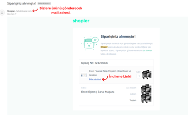 Yukarıdaki yöntemin yanı sıra sipariş sırasında sisteme girdiğiniz mail adresinize de dijital ürünü indirebileceğiniz mail iletilir. hello@shopier.com adresinden gelen mail de "Dijital Ürünü İndir" butonuna basarak dökümanı indirebilirsiniz.
